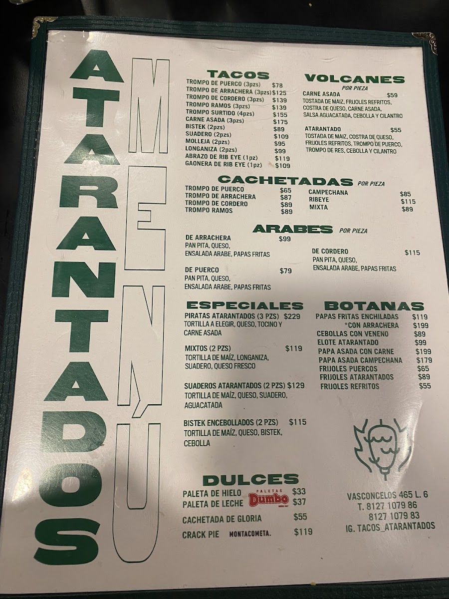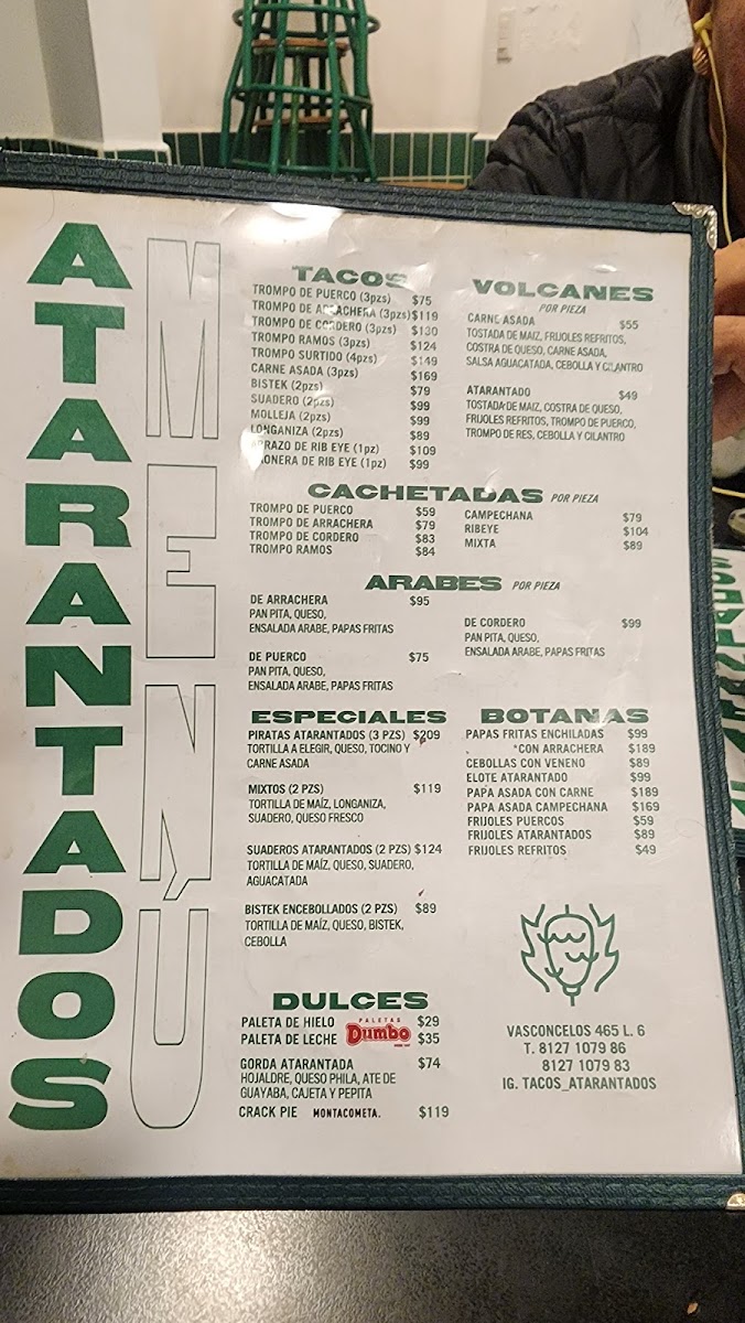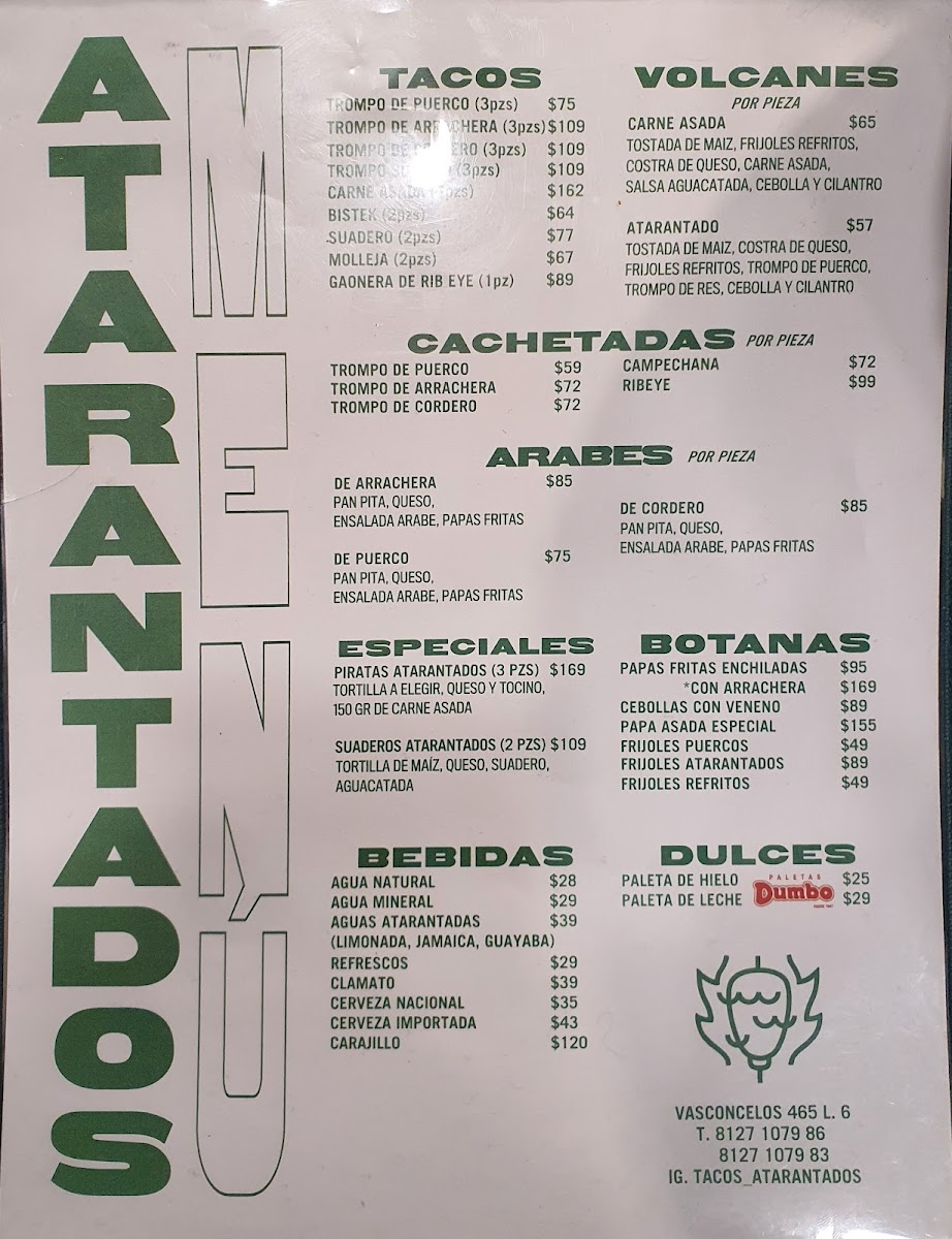 Welcome to Tacos Atarantados, a culinary gem nestled on Av. José Vasconcelos in San Pedro Garza García, N.L., Mexico. This taco haven boasts an impressive menu that delights both locals and visitors alike. With a focus on traditional flavors, the taco selection is a testament to authenticity. Diners rave about the Pastor de Puerco and lamb tacos, which offer a burst of rich, savory goodness in every bite.
